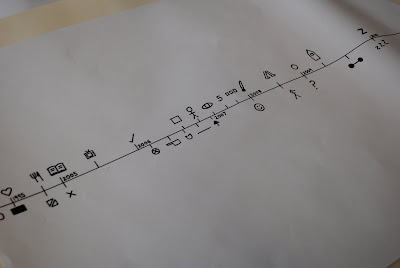 Then, in partners we were to combine our time lines and produce a whole one of our lives with the use of pictograms. We split it up into years and used above the line and under the line for each person.